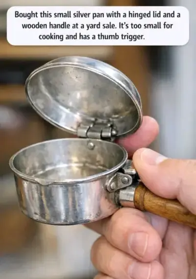 Yard sales are treasure troves for those with a keen eye and a love for history. Among the eclectic mix of household items and forgotten antiques, you can often find unique pieces that spark curiosity and imagination. One such find was a small silver pan with a hinged lid and a wooden handle, seemingly too small for any practical culinary use.At first glance, this intriguing object might appear to be a piece of cookware designed for a dollhouse or a novelty item meant purely for display. However, upon closer inspection, the pan reveals a more intentional design, complete with a thumb trigger, hinting at a specific purpose that history enthusiasts and collectors might find fascinating.