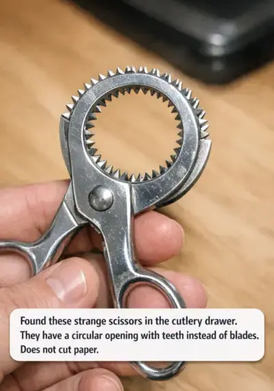 Found these strange scissors in the cutlery drawer. They have a circular opening with teeth instead of blades. Does not cut paper.