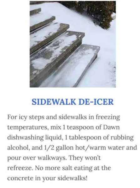 Apparently, a solution of one teaspoon of Dawn dish soap, one tablespoon of rubbing alcohol, and 1/2 gallon of hot or warm water is all you need to combat icy stairs and walkways this winter. If you pour the solution over these areas, they won’t refreeze. The benefit of using this method as opposed to road salt is that the salt eats away at the concrete in your sidewalks and walkways over time.
