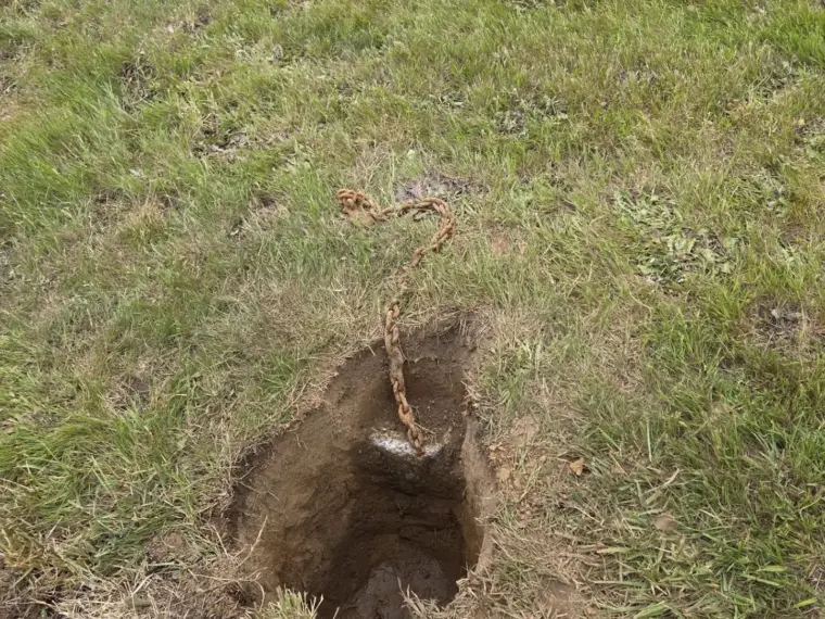 A chain. Rusted. It’s buried at about eight inches below the surface.