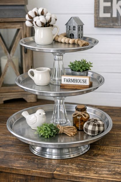 In the world of home décor, finding the perfect farmhouse-style tiered tray can be both costly and time-consuming. However, with a few simple materials, you can create your own stunning DIY farmhouse tiered tray that is both chic and functional. Whether for organizing your kitchen essentials or displaying seasonal decorations, this project is a great way to add a personalized touch to your home. By using metal pizza pans and glass candlesticks, you can create an eye-catching piece that is sure to be a conversation starter.