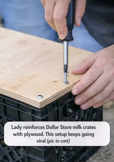 Lady reinforces Dollar Store milk crates with plywood. This setup keeps going viral