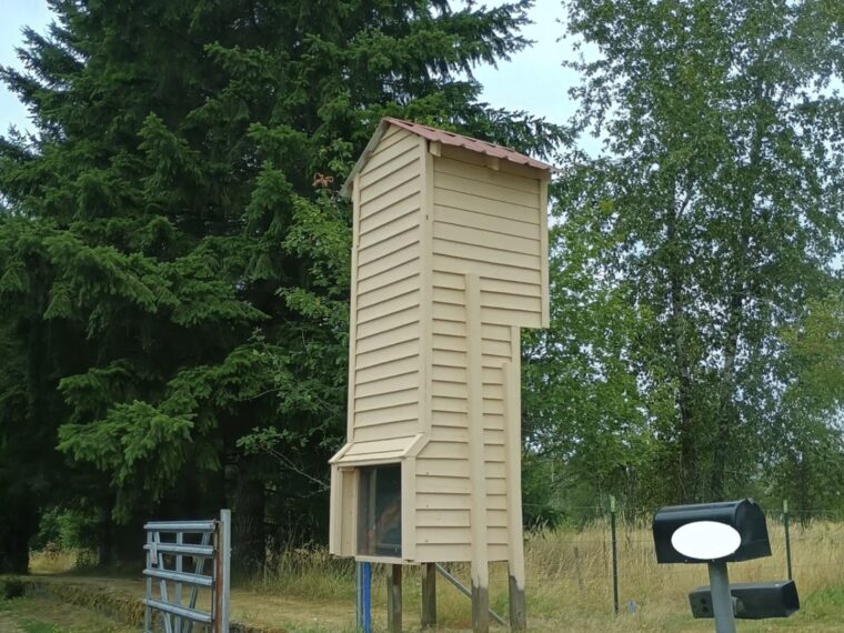 For months, curious drivers passing through rural Oregon have been scratching their heads over a peculiar wooden tower standing tall beside a quiet country road. Measuring about 15 feet in height and resembling a mix between a birdhouse and a water tower, this strange structure became something of a local enigma.