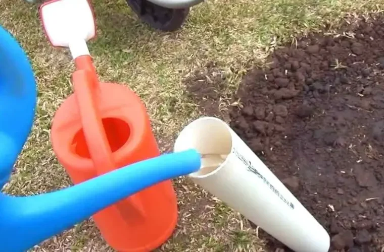 At this point we have to move our offspring still in the growth phase and fix it well on the ground . If you are wondering, the tube has a specific and ingenious function: by pouring water inside, we will make it penetrate deeply into the roots of our tree. The tree will be able to absorb all nutrients necessary for its development, and this is the secret to giving it more strength and vigor.