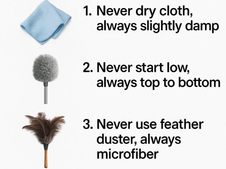 One of the most common mistakes people make when dusting is starting from the bottom and working their way up. This is counterproductive because gravity causes dust to fall downward, meaning you’ll have to redust lower surfaces if you start there. Always begin dusting from the highest points in a room, such as ceiling fans, light fixtures, and high shelves, and work your way down.